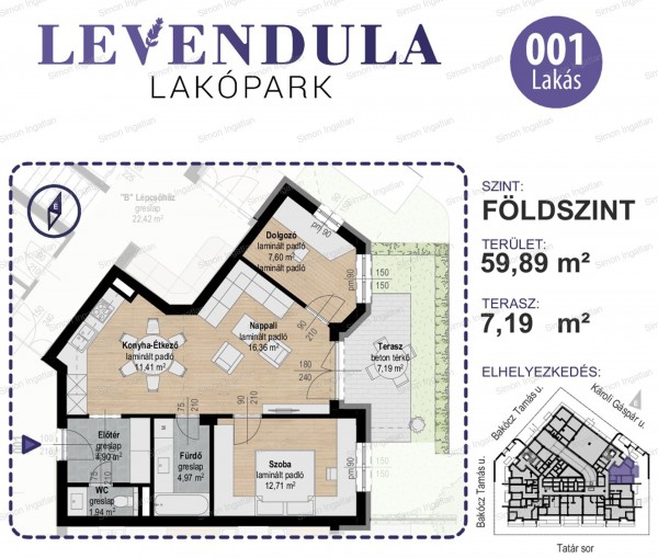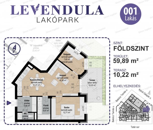 | bővebb leírás: | Levendula lakóparkban földszinti nappali + 2 szobás lakás várja első tulajdonosát! A lakás 59,89 m2, melyhez 7,19 m2-es terasz tartozik. A lakások teljesen egyedi igények alapján is készülhetnek, akár alaprajzi módosításra is van lehetőség. Dinamikusan fejlődő Kecskemét városában, sport-, szabadidő- és egyetemi központjához közel a Bakócz Tamás utca 1. szám alatt épül a legújabb környezetbarát, energiatudatos beruházásunk a LEVENDULA lakópark. A lakópark közvetlen közelében található a Kecskeméti Fürdő, a tenisz- és atlétikai pálya. A lakópark vonzáskörzetében sok lakóépület mellett megtalálható a Messzi István Sportcsarnok, az élelmiszerboltok, étterem, koncertterem, valamint a Neumann János Egyetem számos épülete köztük a nemrég átadott Gazdaságtudományi Kar épületei. Az épület két lépcsőházból áll, és belső kerttel rendelkezik, melyre az 1. emeleten kertkapcsolatos lakások nyílnak. A földszinten a Tatár sor felől úgyszintén kertkapcsolatos lakások az Bakócz Tamás utca felől pedig üzletek épülnek. A 3. emeleten több nagy tetőterasszal rendelkező lakás kerül kialakításra. Az épületben két lépcsőház és két lift kerül elhelyezésre. Az épületben talajszondás hőszivattyúk biztosítják a hűtést, a fűtést és meleg víz előállítást. A hőszivattyúk energiaszükségletének egy részét a tetőre helyezett napelemek termelik meg. Hőhídmentes épületburokba igényes anyagokkal precíz módon kivitelezett lakások építését visszük véghez. Előnyök: 30 éves tapasztalattal rendelkező több mint 1000 lakást már megépítő magyar tulajdonú kivitelező, aki az átadást követően vállalja a közös képviseletet, valamint befektetők részére vállalja a lakások kezelését (kiadását, bérlő és lakás gondozását). Az Építő Simon Kft által épített lakások rendkívüli értékállóságról tesznek tanúbizonyságot, a használt piacon keresettek. Az építő cég minden egyedi igény megvalósít, ami csak lehetséges. |